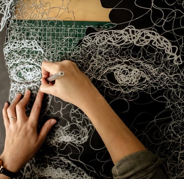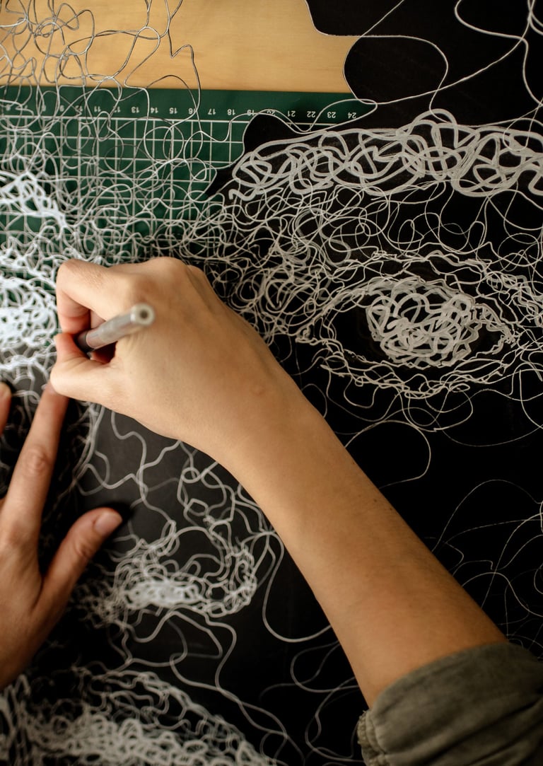 Bien que l’idée première est de proposer des œuvres le plus contrastées possible, tranchantes et incisives, il m’est néanmoins impossible de réaliser des créations trop anguleuses, trop géométriques, trop droites. Tel l’esprit humain, j’ai besoin de cheminer, de revenir sur mes pas, d’être constamment en mouvement pour me sentir vivante. Cela se traduit dans mes créations par les ondulations de mes lignes, par ces fils de papiers que l’on croit s’enrouler entre eux, pour rappeler que rien n’est simple, que tout objectif nécessite des réajustements, de louvoyer, de s’adapter, d’avancer.