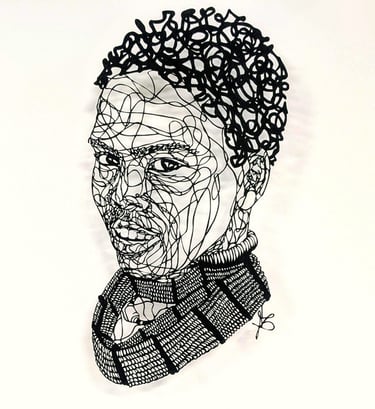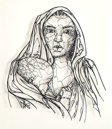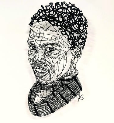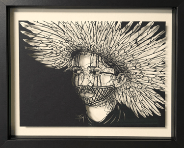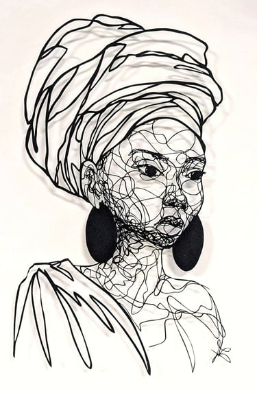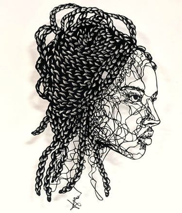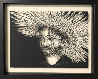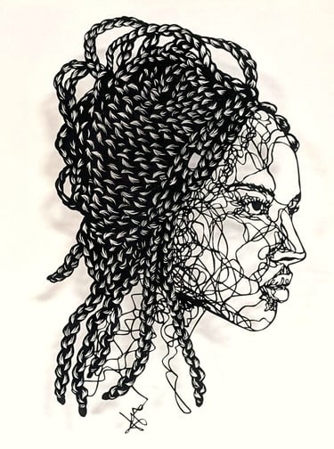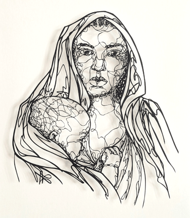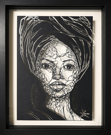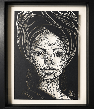 Dans cette collection, le fil tissé est celuis des émotions sur les visages, au travers de leurs ondulations. Chaque ligne nous imprègne d’une sensation, d’un ressenti, d’un sentiment et nous connecte au visage que nos yeux scrutent. Il est question de posture, de maintien de tête, surtout sur les portraits de femmes du continent africain, ces femmes me fascinent par leur aura, leur dignité. Ces personnes, qui prennent vie par mes découpages sont souvent en cours de réflexion : elles regardent au loin, mêlent leurs pensées à l’environnement qui les entoure.