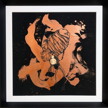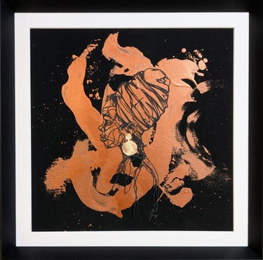 Dentelle de papier découpée au scalpel puis collée sur toile, peinture acrylique, dorure feuilles cuivrées