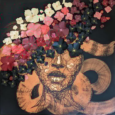 Dentelle de papier découpée au scalpel puis collée sur toile, peinture acrylique, fleurs en papier, dorure feuilles cuivrées